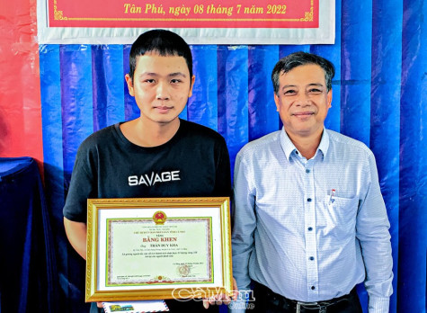 | Ông Huỳnh Công Luận, Trưởng phòng Nội vụ huyện Cái Nước, trao bằng khen của Chủ tịch UBND tỉnh cho em Trần Duy Kha. |