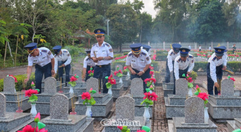 | Cán bộ, chiến sĩ Hải đoàn thắp hương tại Nghĩa trang Liệt sĩ huyện Năm Căn. |