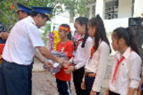 Đại diện Hải đội 402 trao quà các em học sinh trường THCS Bông Văn Dĩa.