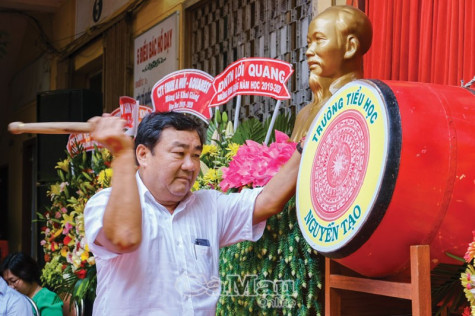 Chủ tịch HĐND tỉnh Cà Mau Trần Văn Hiện đánh trống khai giảng năm học mới tại Trường Tiểu học Nguyễn Tạo. Ảnh: K.P |