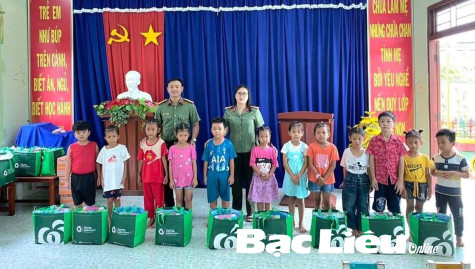 Công an tỉnh tặng quà cho học sinh nghèo xã Vĩnh Trạch Đông (TP. Bạc Liêu). Ảnh: T.Q