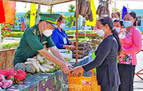 | Đại uý Phạm Nam Sơn hỗ trợ người dân tại “Gian hàng 0 đồng” do đơn vị tổ chức trong dịp Tết Nguyên đán Nhâm Dần 2022. |