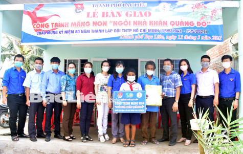 Vậy là căn nhà xiêu vẹo, lắc lư theo từng cơn gió mạnh và lọt thỏm giữa vùng nước trắng xóa không nhìn thấy lối đi mỗi mùa mưa bão của gia đình em Thạch Vĩnh Kỳ (lớp 5/2, Liên đội Trường tiểu học Lê Lợi, ấp Biển Tây B, xã Vĩnh Trạch Đông, TP. Bạc Liêu) đã được thay mới bằng “Ngôi nhà Khăn quàng đỏ”. Nhận những phần quà ấm áp trong ngày được bàn giao nhà mới, Vĩnh Kỳ và cha không giấu được niềm hạnh phúc…