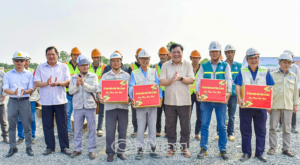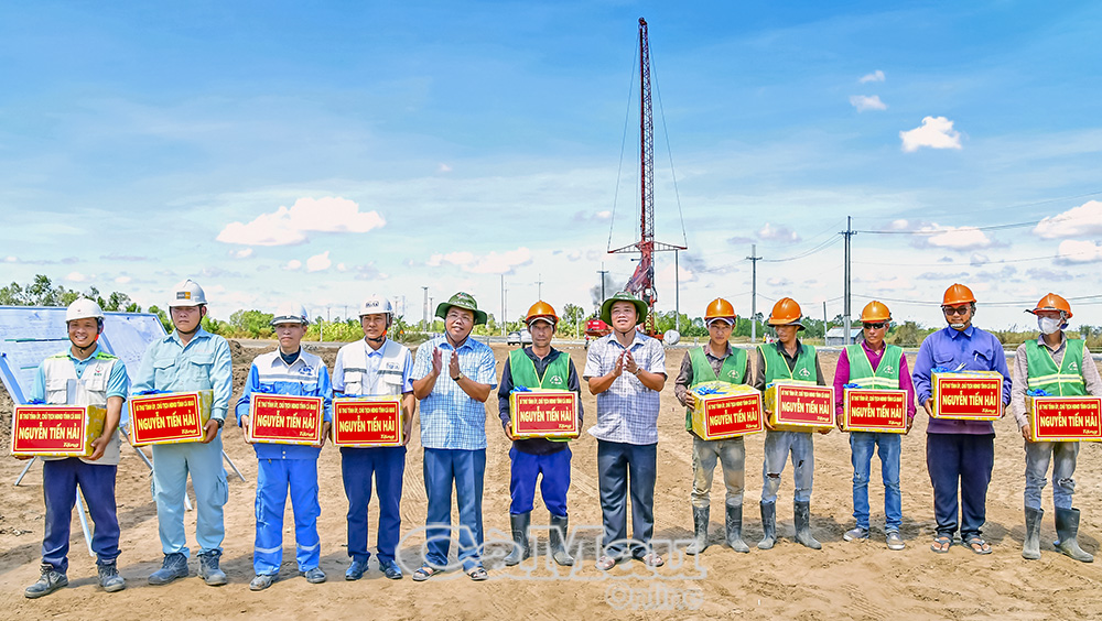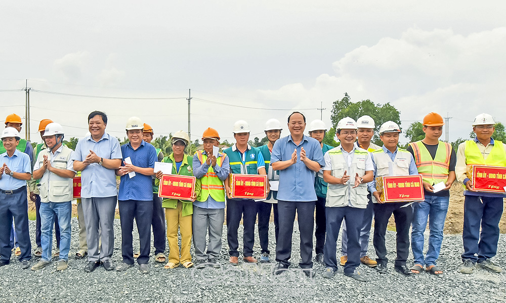 Đồng hành với dự án, lãnh đạo tỉnh luôn quan tâm, thường xuyên kiểm tra, tặng quà động viên kỹ sư, công nhân trên công trường cao tốc Cần Thơ - Cà Mau, đoạn trên địa bàn tỉnh Cà Mau. (Ảnh chụp tháng 5/2024).
