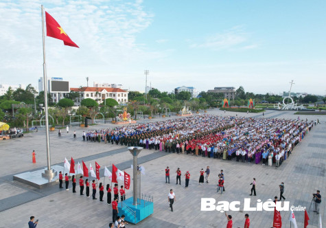 Nghi thức rước đuốc, thắp sáng đài lửa Hành trình đỏ tại Quảng trường Hùng Vương (TP. Bạc Liêu).