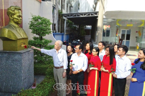 | Nhà báo Phạm Văn Tri cùng đội ngũ phóng viên báo Cà Mau viếng tượng đài Nhà báo - Anh hùng liệt sĩ Nguyễn Mai tại khuôn viên báo Cà Mau. Ảnh: NHÂN KIỆT |