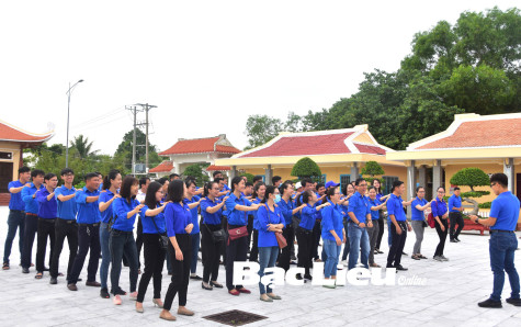 Đoàn viên - thanh niên khối các cơ quan tỉnh tham gia trò chơi giao lưu trong chuyến về nguồn tại Khu lưu niệm nghệ thuật Đờn ca tài tử Nam Bộ và nhạc sĩ Cao Văn Lầu.