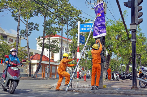 | Nhân viên ngành điện treo băng rôn tuyên truyền thanh toán tiền điện không dùng tiền mặt. |