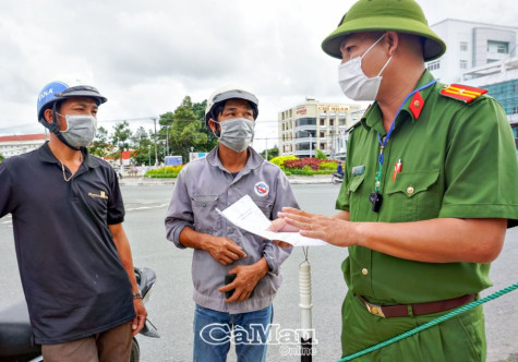 | Lực lượng trực chốt kiểm soát Phường 5, TP Cà Mau quét mã QR kiểm tra người đi đường. |