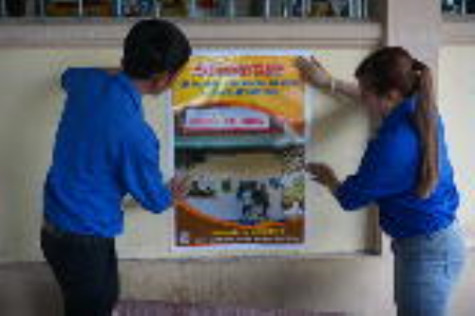 | Đoàn viên, thanh niên dán pa-nô tuyên truyền. |