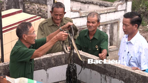 Ông Lê Văn Tửng (bìa trái) chia sẻ quá trình nuôi rắn với Hội Cựu chiến binh xã Phong Thạnh Tây B. Ảnh: T.L