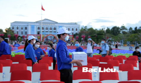 Tình nguyện viên sắp xếp ghế và chuẩn bị nước uống cho đại biểu tham dự lễ khai mạc Ngày hội Văn hóa - Du lịch Bạc Liêu và Lễ hội Dạ cổ hoài lang năm 2022.
