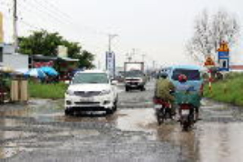 | Mặt đường Võ Văn Kiệt, đoạn gần ngã ba đường Xuyên Á - Võ Văn Kiệt, hư hỏng gần như hoàn toàn, phương tiện giao thông di chuyển rất khó khăn. |