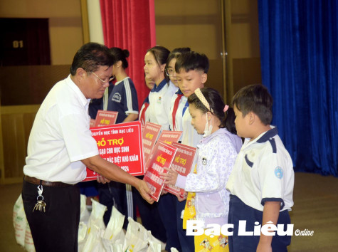 Tại buổi lễ, Hội Khuyến học tỉnh đã trao bảng tượng trưng hỗ trợ gạo cho 150 em học sinh có hoàn cảnh khó khăn tại TP. Bạc Liêu (mỗi em nhận 20kg gạo). Được biết, Hội sẽ trao tổng số 14 tấn gạo cho 700 em học sinh trên địa bàn tỉnh.