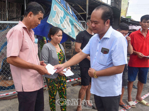 Ông Trần Minh Nhân, Phó chủ tịch UBND huyện Thới Bình, trao tiền hỗ trợ các hộ dân thiệt hại trong vụ cháy.