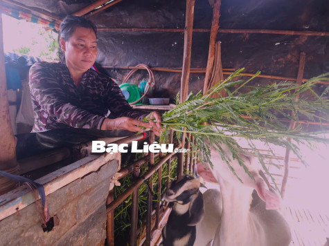 Chị Thạch Thị Oạch chăm sóc đàn dê thương phẩm của gia đình.