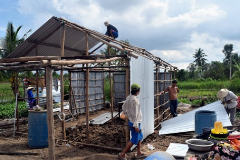 | Với sự giúp đỡ của bà con láng giềng, gia đình bà Châu Thị Hiền cất lại nhà ở tạm. |