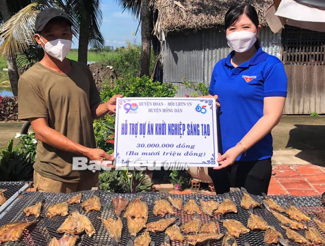 Huyện đoàn Hồng Dân hỗ trợ dự án khởi nghiệp làm khô cá lóc và nuôi tôm càng xanh của thanh niên Nguyễn Hoàng Mau (ấp Lộ Xe A, xã Vĩnh Lộc A). Ảnh: Đơn vị cung cấp