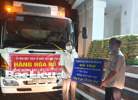 Tối 26/7, Ủy ban MTTQ Việt Nam tỉnh tiếp tục vận chuyển hàng hóa hỗ trợ Hội đồng hương Bạc Liêu - Cà Mau tại TP. Hồ Chí Minh - ảnh. Đây là đợt thứ 2 Bạc Liêu chuyển hàng hóa hỗ trợ người dân Bạc Liêu đang gặp khó khăn do dịch COVID-19 tại TP. Hồ Chí Minh, Bình Dương, Đồng Nai gồm: 7 tấn gạo và 350kg khô với tổng trị giá 175 triệu đồng. Như vậy, tổng 2 đợt mà Bạc Liêu hỗ trợ hoạt động của Hội đồng hương tại TP. Hồ Chí Minh là 550 triệu đồng, trong đó có 200 triệu đồng tiền mặt.