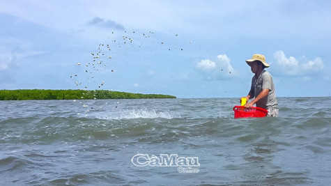 | Hội viên nông dân xã Ðất Mũi thả nghêu giống vụ mới. |
