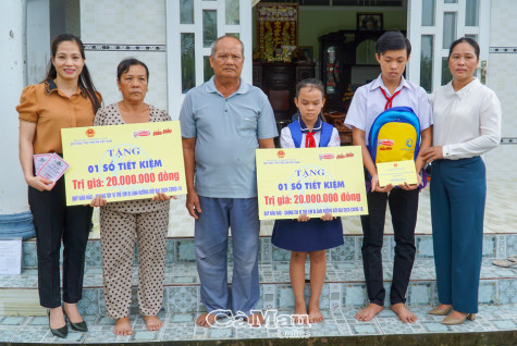 | Đại diện Quỹ Bảo trợ trẻ em Việt Nam trao quà hỗ trợ cho 5 trẻ em mồ côi tại 3 xã Tân Phú, Tân Lộc Bắc và xã Thới Bình, mỗi phần quà trị giá 5 triệu đồng tiền mặt. |