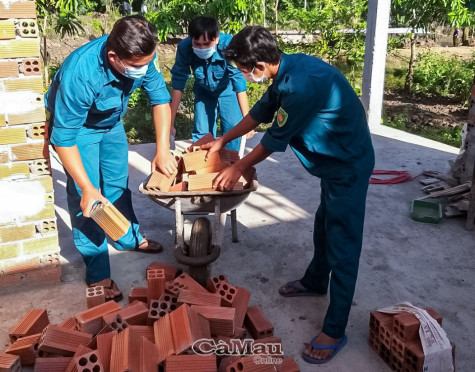 | Dân quân xã Hoà Tân xây dựng nhà cho bà Nguyễn Thị Bận. Ảnh: Chí Nguyện |