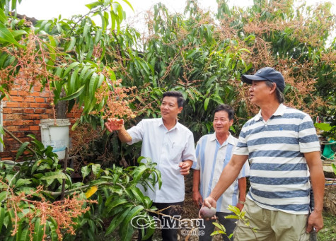 | Ông Lê Văn Tài (bìa trái) tham quan mô hình trồng hoa màu, cây ăn trái của ông Võ Văn Nguồn (bìa phải). |