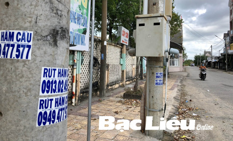 Biển quảng cáo “ôm” trụ điện đường Nọc Nạng (Khóm 1, Phường 1, TX. Giá Rai). Ảnh: N.Q