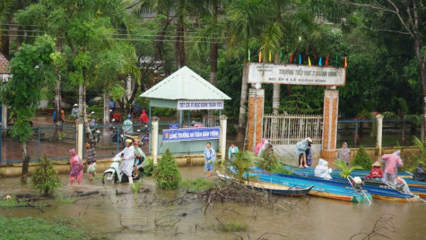Hơn 1 tuần trước, trường Tiểu học 6 xã Khánh Bình Đông đang đẩy nhanh tiến độ nâng cấp sân trường. Do mực nước trên sông dâng cao làm cho đoạn lộ trước cổng trường dài hơn 50 m và sân trường đã ngập sâu trong nước. Nhiều phụ huynh phải đưa đón học sinh đến tận cổng trường bằng xe máy bì bõm trong nước, hoặc chở con em bằng xuồng máy.
