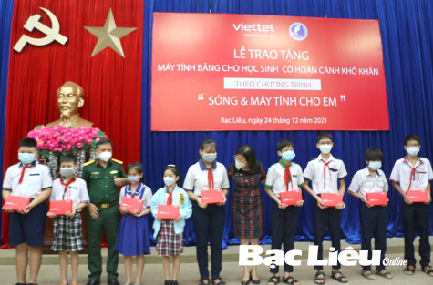 Tặng máy tính bảng cho học sinh có hoàn cảnh khó khăn. Ảnh: K.K