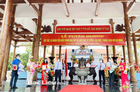 Lãnh đạo Huyện ủy Vĩnh Lợi trao Bảng tuyên dương cho các tập thể, cá nhân tiêu biểu trong học tập và làm theo tư tưởng, đạo đức, phong cách Hồ Chí Minh. Ảnh: H.L