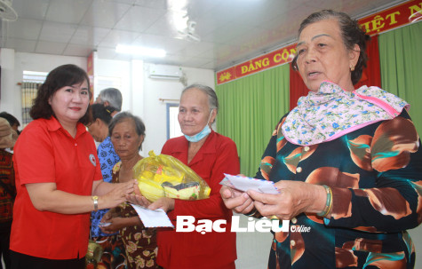 Bà Lê Việt Hà - Phó Chủ tịch Hội Chữ thập đỏ tỉnh Bạc Liêu trao quà cho người dân có hoàn cảnh khó khăn.
