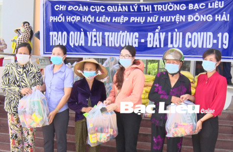 Hội LHPN huyện Đông Hải phối hợp với Chi đoàn Cục Quản lý thị trường tỉnh tặng quà cho hội viên, phụ nữ có hoàn cảnh khó khăn do ảnh hưởng của dịch COVID-19 trên địa bàn huyện. Ảnh: H.L