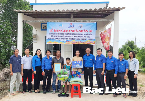 Nằm trong chuỗi các hoạt động chào mừng Đại hội đại biểu Đoàn TNCS Hồ Chí Minh tỉnh Bạc Liêu lần thứ XI, nhiệm kỳ 2022 - 2027 và kỷ niệm 66 năm Ngày truyền thống Hội LHTN Việt Nam, ngày 12/10, Tỉnh đoàn - Hội LHTN Việt Nam tỉnh phối hợp với địa phương bàn giao nhà nhân ái cho gia đình anh Nguyễn Minh Tâm (ấp Trà Co, xã Minh Diệu, huyện Hòa Bình) và hộ ông Thạch Xuông (ấp Cái Tràm B, thị trấn Hòa Bình, huyện Hòa Bình) với tổng kinh phí là 80 triệu đồng do Công ty TNHH MTV Xổ số kiến thiết Bạc Liêu hỗ trợ.