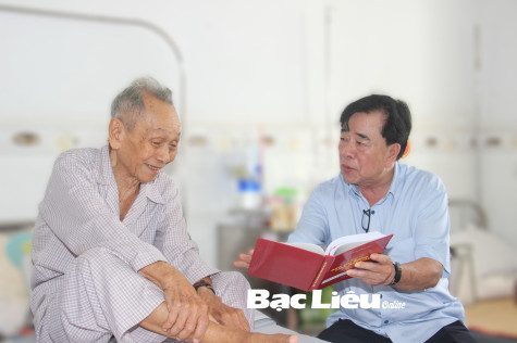 Ông Ngô Minh Chánh (Sáu Thi, bên trái) xem lại hình ảnh của mình trong sách “Lịch sử báo chí Đảng bộ tỉnh Bạc Liêu (1930 - 2025)”. Ảnh: N.Q