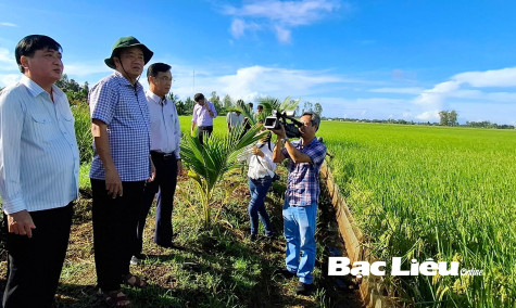 Lãnh đạo tỉnh và TX. Giá Rai tham quan mô hình lúa hữu cơ ở xã Phong Thạnh A. Ảnh: M.Đ