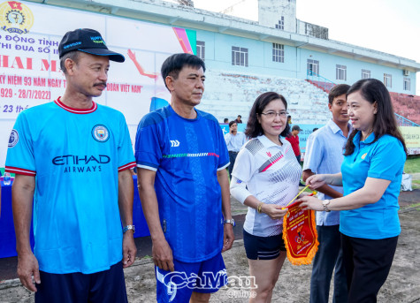 | Bà Huỳnh Út Mười, Chủ tịch LĐLĐ tỉnh Cà Mau, trao cờ lưu niệm cho các đội tham gia Hội thao. |