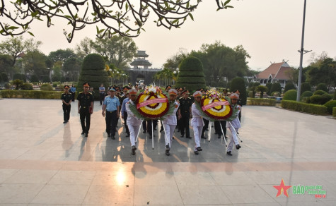 Các đại biểu trong Ban chỉ đạo Hội thảo khoa học cấp quốc gia kỷ niệm 70 năm Chiến thắng Điện Biên Phủ dâng hương, dâng hoa, tri ân các Anh hùng liệt sĩ tại Nghĩa trang liệt sĩ quốc gia A1, tỉnh Điện Biên. Ảnh: QĐNDO