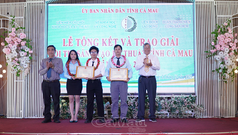 Báo Cà Mau Chiều 26/12, Ban Tổ chức Hội thi Sáng tạo kỹ thuật tỉnh Cà Mau tổ chức Lễ tổng kết và trao giải Hội thi Sáng tạo kỹ thuật tỉnh Cà Mau (năm 2024-2025). Tham dự buổi lễ có đại diện lãnh đạo các sở, ban, ngành, địa phương cùng 44 tác giả, nhóm tác giả đoạt giải.