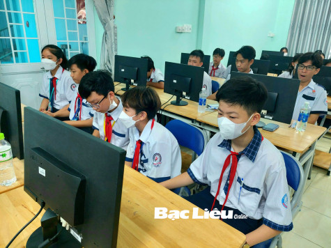 Các thí sinh bảng B thực hiện bài thi tại Hội thi Tin học trẻ TP. Bạc Liêu lần thứ 10 - năm 2023. Ảnh: H.L