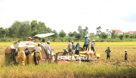 Phong trào thi đua Nông dân sản xuất - kinh doanh giỏi thu hút đông đảo hội viên, nông dân tham gia. Trong ảnh: Nông dân xã Châu Thới (huyện Vĩnh Lợi) thu hoạch lúa. Ảnh: N.Q