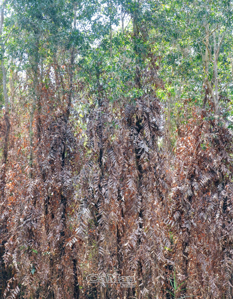 Nắng hạn gay gắt, lượng nước dưới chân rừng bốc hơi nhanh, lớp thực bì và dây leo trên thân tràm bắt đầu khô héo, nguy cơ cháy rừng ngày càng cao. Ảnh: TRẦN NGUYÊN