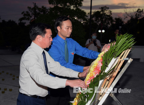 Tại buổi lễ, Phó Chủ tịch UBND tỉnh - Phan Thanh Duy và Bí thư Tỉnh đoàn - Phạm Tuấn Tài đã trang trọng đặt tràng hoa trước đài Tổ quốc ghi công. Và trong không khí trang nghiêm của buổi lễ, các đại biểu, đoàn viên - thanh niên đã dành phút mặc niệm và dâng hương tưởng nhớ các anh hùng liệt sĩ .