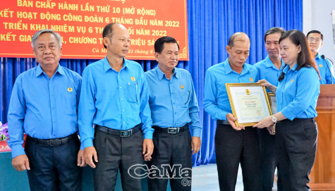 | Chủ tịch Liên đoàn Lao động tỉnh Cà Mau Huỳnh Út Mười trao bằng khen cho các tập thể có thành tích xuất sắc trong tham gia Chương trình 1 triệu sáng kiến giai đoạn 1. |