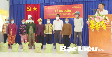 Tặng quà cho người dân khó khăn trong lễ ra quân Năm Dân vận khéo tại xã Ninh Hòa. Ảnh: Đ.H