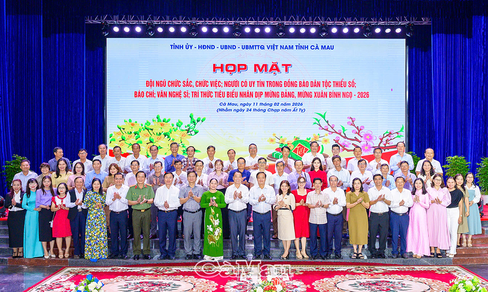 Chiều 11/2 (24 Tết), Tỉnh uỷ - HĐND - UBND - Uỷ ban MTTQ Việt Nam tỉnh Cà Mau tổ chức buổi họp mặt đội ngũ chức sắc, chức việc; người có uy tín trong đồng bào dân tộc thiểu số; báo chí; văn nghệ sĩ và trí thức tiêu biểu trong tỉnh nhân dịp mừng Đảng, mừng Xuân Bính Ngọ 2026.