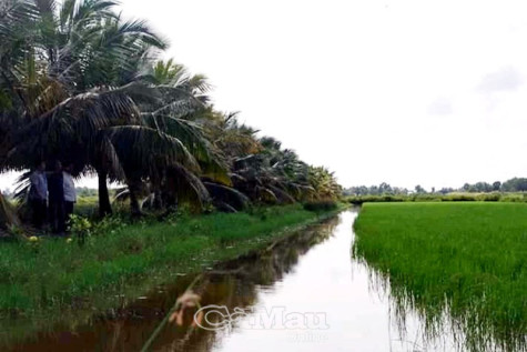 | Ông Trần Văn Hoà, Khóm 4, Phường 8 còn trồng dừa trên bờ bao đất tôm - lúa. |