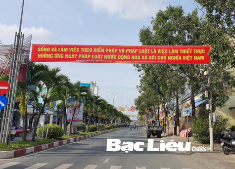 Treo băng-rôn tuyên truyền Ngày Pháp luật trên các tuyến đường chính của TP. Bạc Liêu.