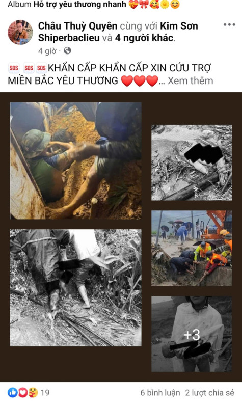 Thắt lòng trước những mất mát, tang thương mà đồng bào miền Bắc đang đối diện, trưa 10/9, chị Châu Thùy Quyên (Phường 7, TP. Bạc Liêu) đã đăng bài kêu gọi mọi người chung tay hỗ trợ, số tiền nhận được sẽ được nhóm từ thiện của chị dùng mua phao cứu sinh, lương thực, nước lọc…, trực tiếp vận chuyển đến người dân ở các tỉnh Lào Cai, Yên Bái, Tuyên Quang và Thái Nguyên.