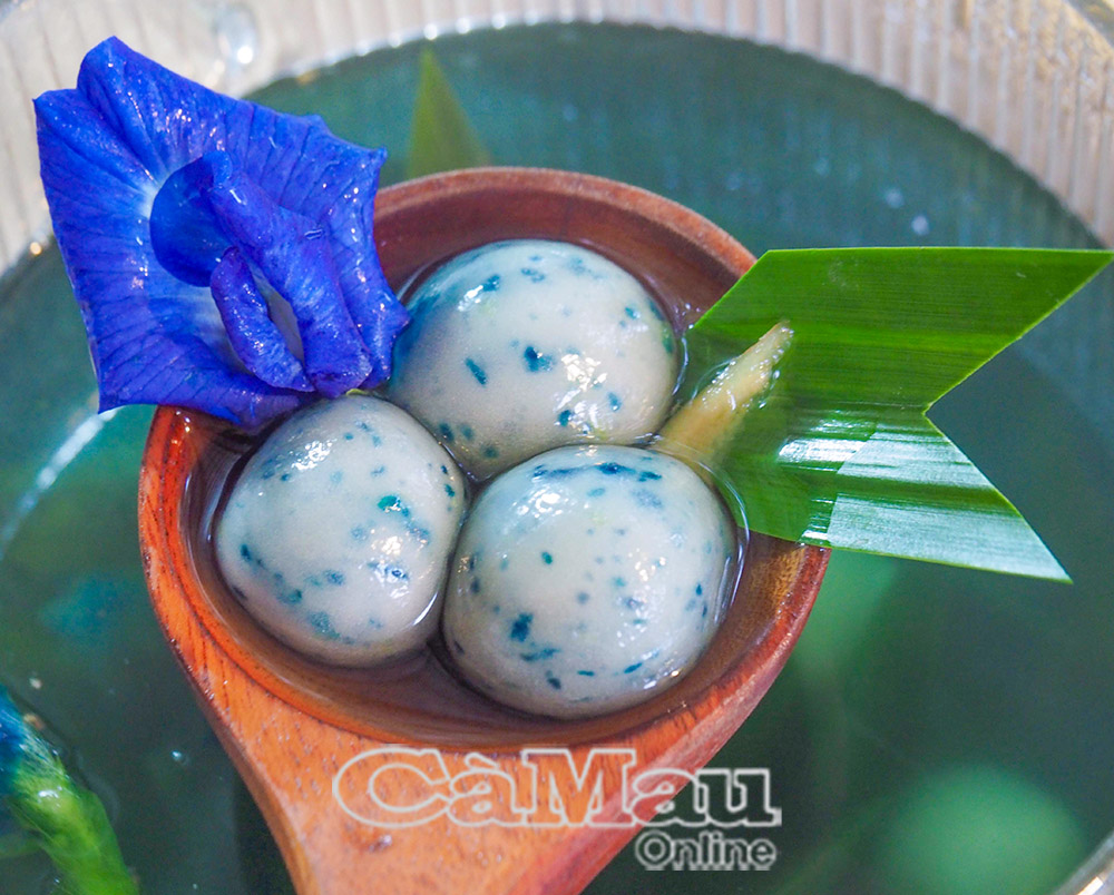 Món chè cua độc đáo, kết hợp bột nếp, thịt cua, đậu xanh cùng màu xanh tím từ hoa đậu biếc, tạo nên hương vị lạ và thú vị.